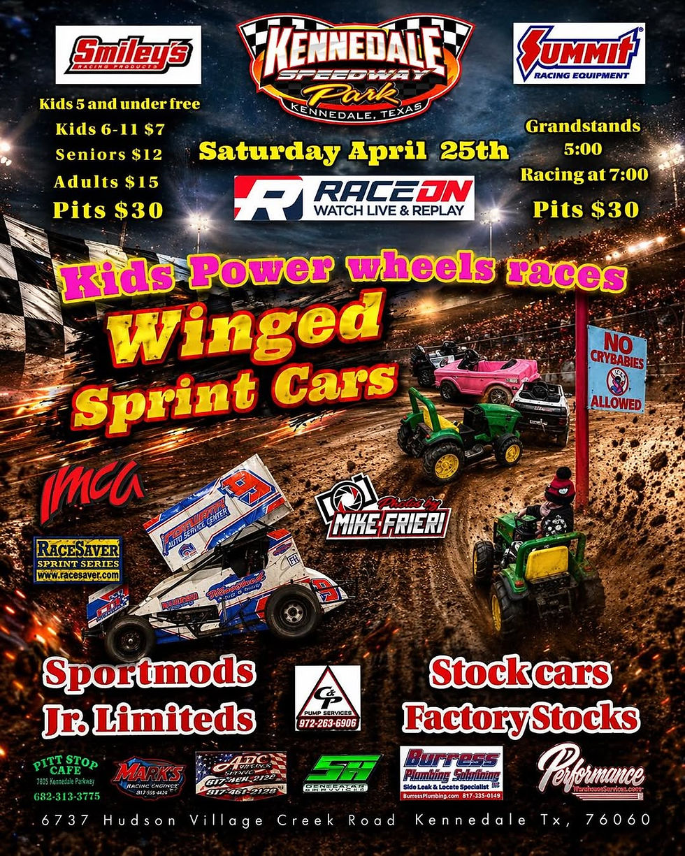 Kennedale Speedway Park's next race will be Saturday, April 25th, and will feature the IMCA RaceSaver 305 Winged Sprint Cars plus the IMCA Sportmods, IMCA Stock Cars, Factory Stocks, and the Jr. Limiteds. Kids Power Wheel races during intermission.