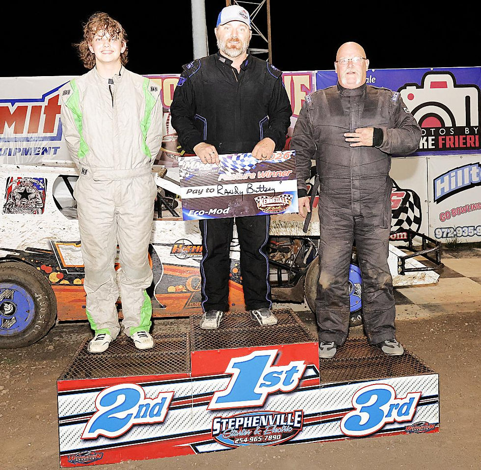 Eco Mods $500 feature results: Randy Buttery was your feature winner! 2. Brody Tarrant was a close second, 3. Westley Scott, 4. Kameron Williams, 5. Devon Bowles, 6. Anthony Johnson, 7. Jonathan Loyd, 8. Bennett Zelazny, 9. Justin Rowland, 10. J. D. Millirons, 11. Tanner Kincaid, 12. Gary Nabors, 13. Jeanie Glass, 14. Cody Smith Jr., 15. Brandon Mann, 16. Tyler Hughes, 17. Jim Knight, 18. Kylan Farrington, 19. Kaylee Boyce, and 20. A. J. Gardner.