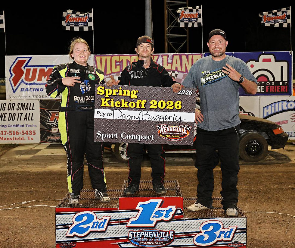 Sport Compacts $150 feature results: Danny Baggerly was your feature winner! 2. Brooke Osler, 3. Stephen Statelier, 4. Colton Bybee, 5. Kollin Teafatiller, 6. Cody Foster, 7. Cecil Rhodes, 8. Bstacie Newcomer, 9. Stacie Ross, 10. Kelly Andrus, 11. Mallory Bontrager, 12. Rick Straten, 13. Jen Miller, 14. Lois Morehead, 15. Steve Bevills, 16. Racer Costello, 17. Mark Earl, and 18. Cliffton Campbell.